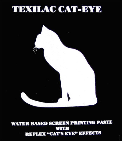 Wodna farba sitodrukowa refleksyjna do druków na tkaninach. Druki z użyciem TEXILAC CAT EYE są srebrne i stają się świecące, błyszczące i odbijają światło po otrzymaniu wiązki światła nawet o bardzo małej intensywności. Używane do druku na odzieży sportowej i roboczej w celu poprawienia widoczności użytkowników odzieży w złych warunkach pogodowych.