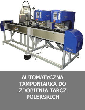 Ta maszyna została zaprojektowana do nadruku na piankowo-plastikowych tarczach polerskich. Tarcze te są używane do nakładania wosku na samochody i ich polerowania. Automatyzacja składa się z dwóch maszyn TTN 350/150 z otwartym kałamarzem, połączonych z liniowym taśmociągiem. Na taśmociągu zamontowano również drukarkę atramentową do nadruku kodu partii, numeru seryjnego i daty produkcji na każdej tarczy. Maszyna może nadrukować około 1200 tarcz na godzinę w 2 kolorach. |